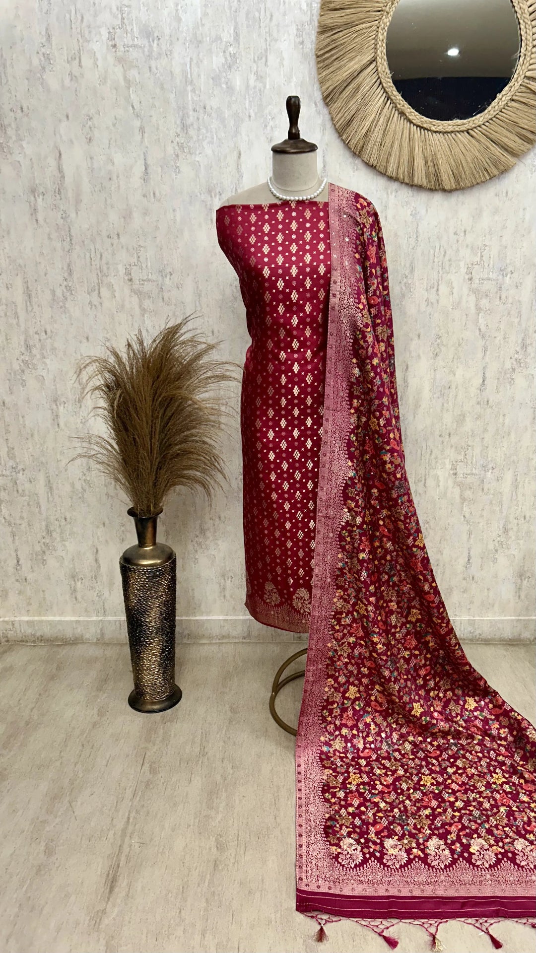 Experience timeless elegance with this Banarasi Silk Unstitched Suit Set, complemented by a rich Banarasi Silk Dupatta. Crafted from premium silk fabric, this unstitched set offers the flexibility to tailor your perfect fit while showcasing intricate traditional motifs. The accompanying Banarasi Silk Dupatta adds a luxurious touch, making this ensemble ideal for formal occasions and cultural celebrations. Elevate your wardrobe with this blend of heritage craftsmanship and customizable comfort.