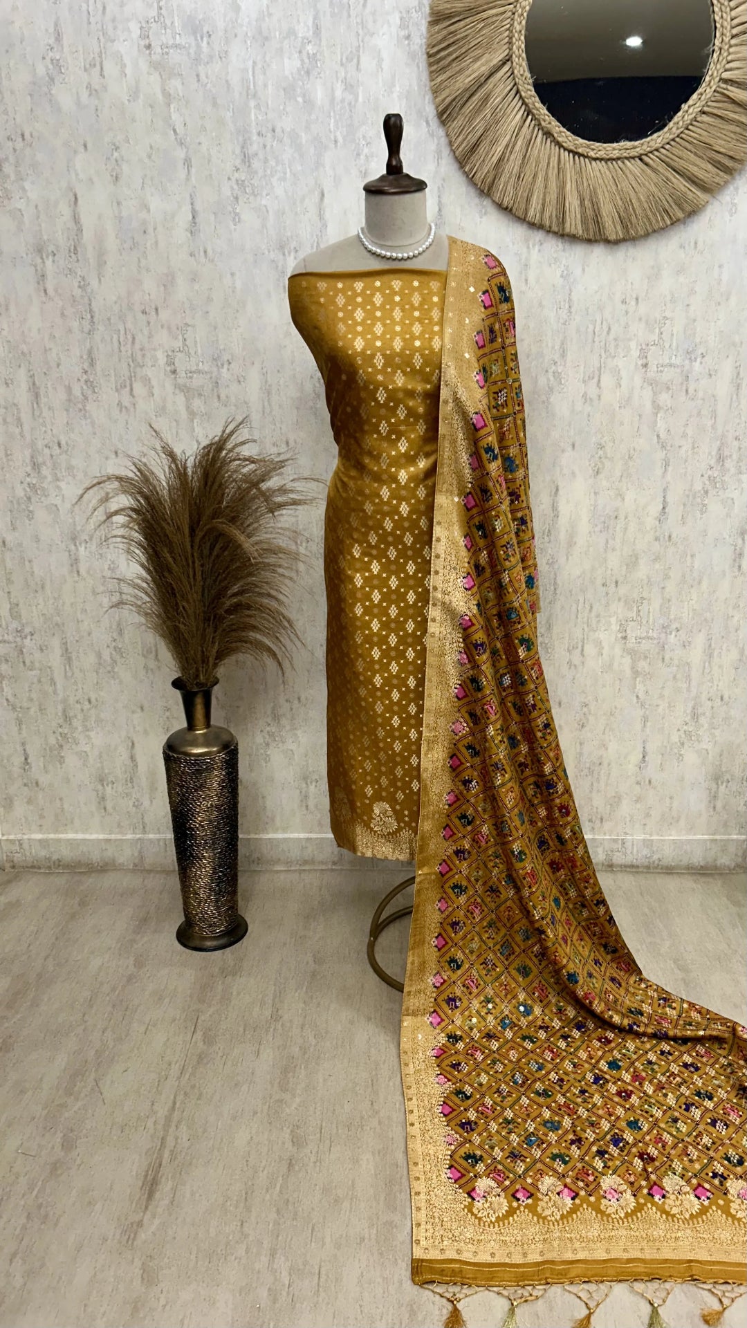 Experience timeless elegance with this Banarasi Silk Unstitched Suit Set, paired with a richly crafted Patola Dupatta. The luxurious silk fabric promises a graceful drape and comfortable wear, while the unstitched format offers the flexibility to tailor the suit to your perfect fit. Complemented by the intricate Patola dupatta, this set delivers a sophisticated blend of traditional artistry and refined style, ideal for formal occasions and festive celebrations. Elevate your wardrobe with this exquisite ensemble guaranteed to showcase craftsmanship and cultural heritage.