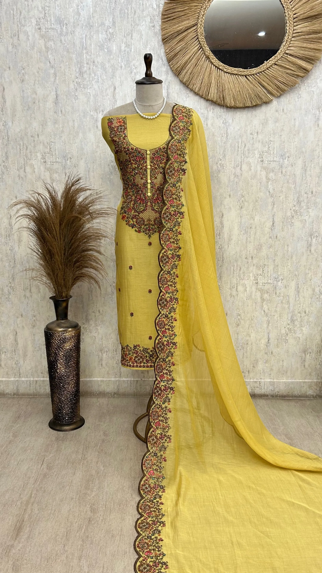 Embrace timeless elegance with this Blush Floral Elegance Unstitched Suit, crafted for the modern woman who values sophistication. Featuring premium Kota fabric for the shirt with delicate floral detailing, paired with soft cotton for the bottom and a graceful Kota dupatta. Each piece arrives unstitched, allowing you to customize the fit to your measurements. Generous lengths—2.5 meters for top and bottom, 2.45 meters for dupatta—ensure ample fabric for tailoring. The refined color palette and intricate design make this suit perfect for festivals, celebrations, or everyday elegance. Dry clean only to maintain the fabric's beauty and longevity.