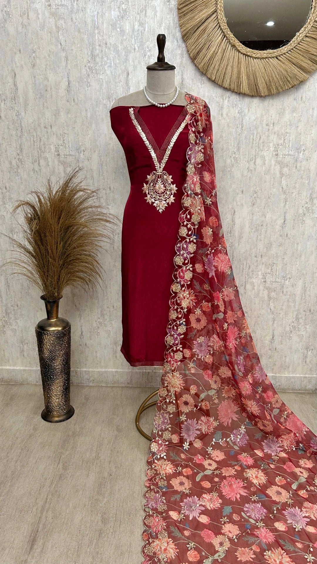 Elevate your wardrobe with this Crepe Unstitched Suit Set, paired beautifully with a delicate floral organza dupatta. The soft crepe fabric offers comfort and versatility, allowing you to tailor the suit to your perfect fit. The floral organza dupatta adds a touch of elegance and charm, making this set ideal for both casual and festive occasions. Embrace timeless style and create your own unique look with this exquisite ensemble.