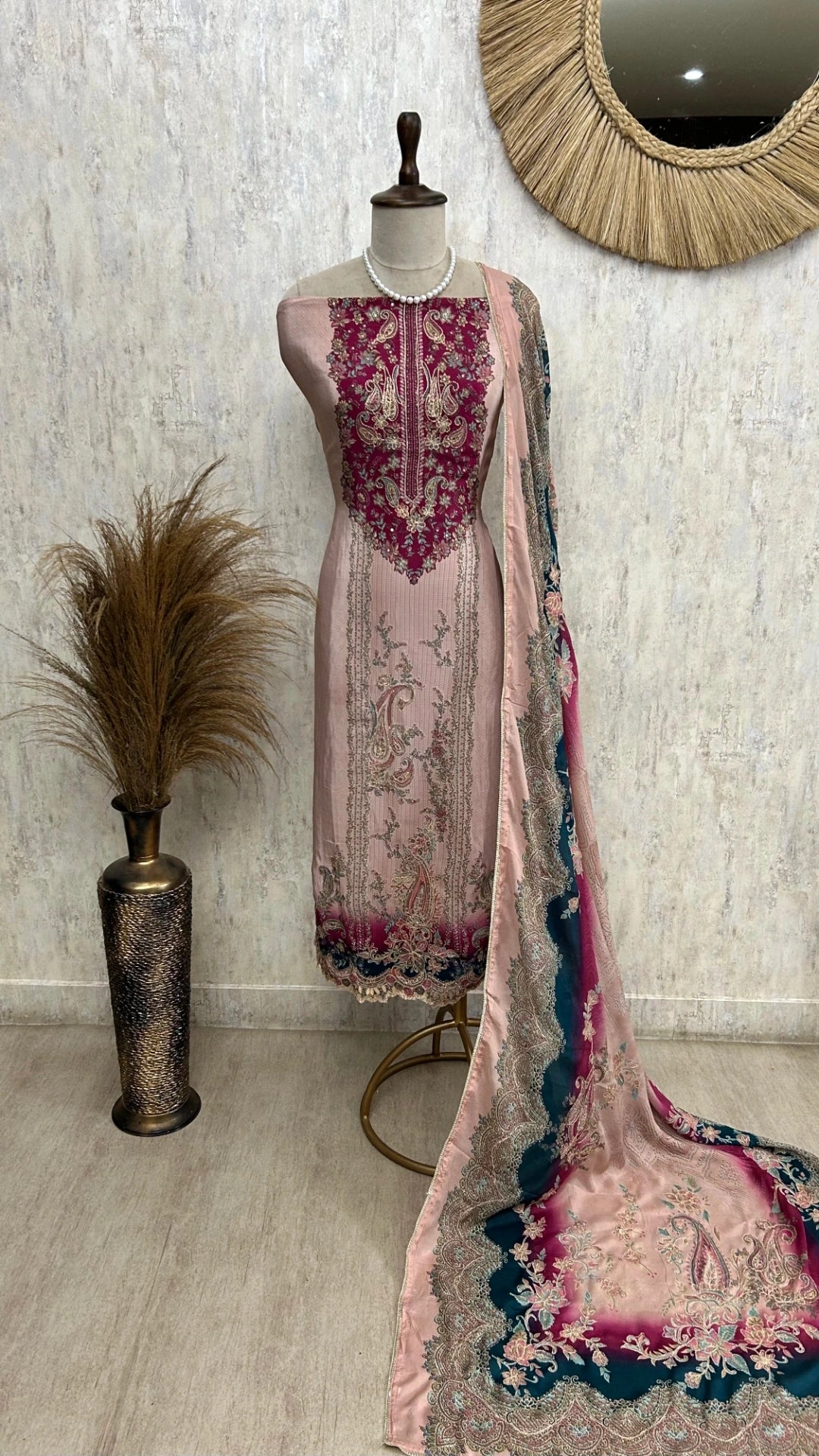 Elevate your wardrobe with this Crepe Unstitched Suit Set featuring intricate zari work. Crafted from premium crepe fabric, it offers a smooth texture and excellent drape, ideal for custom tailoring. The delicate zari embellishments add a subtle sheen, perfect for both formal occasions and festive wear. This unstitched set provides the flexibility to create a personalized fit and style, combining traditional craftsmanship with modern elegance.