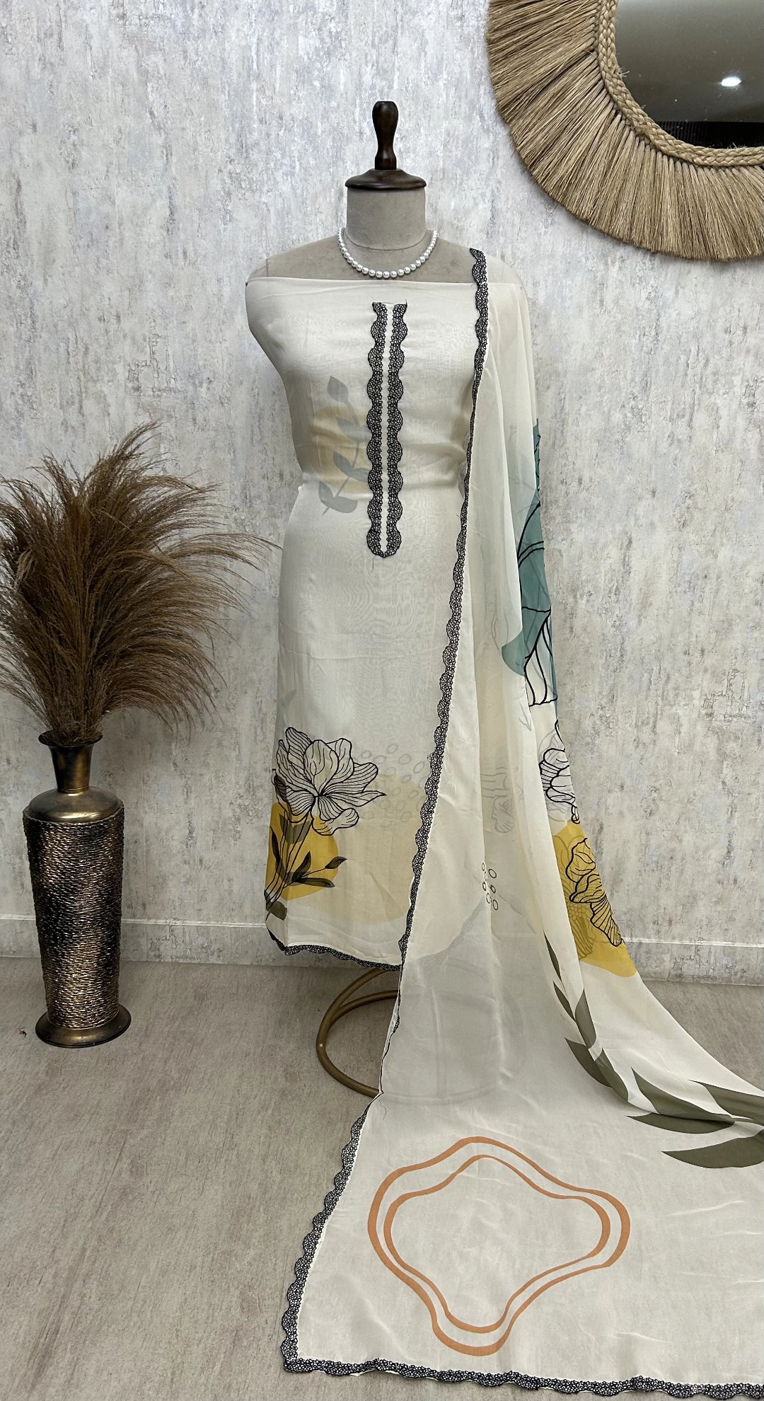 Embrace contemporary elegance with our Digital Print Organza Unstitched Suit Set, where ethereal sheer organza meets nature-inspired artistry. Adorned with a delicate all-over leaf motif, this ensemble is perfect for festive brunches, daytime celebrations, or sophisticated evening gatherings.