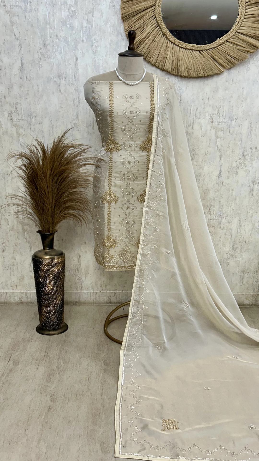 Elevate your wardrobe with this sophisticated pearl beige unstitched suit, designed for those who appreciate timeless elegance. Crafted from premium fabric, this three-piece ensemble offers versatility and refined style for weddings, festivals, and formal occasions. The neutral pearl beige tone complements all skin tones and pairs effortlessly with traditional or contemporary accessories. Perfect for custom tailoring to your exact measurements and preferences, ensuring a flawless fit. Ideal for discerning customers seeking quality craftsmanship and understated luxury.
