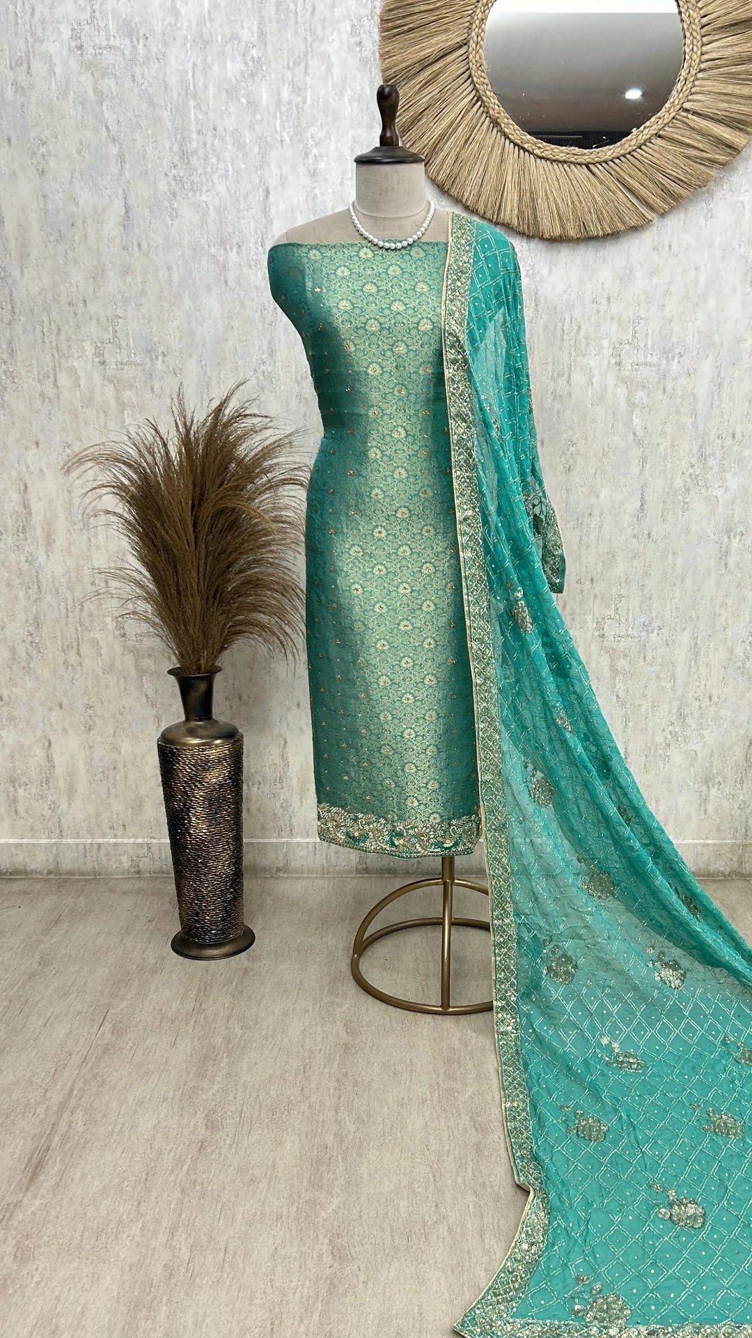 Celebrate special occasions with timeless sophistication. This unstitched suit offers complete creative freedom, allowing you to customize every detail to match your personal style and body measurements. Crafted with premium fabric, it features intricate detailing perfect for weddings, festivals, and formal gatherings. The versatile design works beautifully with traditional accessories and modern styling. Ideal for those who appreciate bespoke tailoring and want a garment that's uniquely theirs. Transform this exquisite fabric into your signature look with a skilled tailor.
