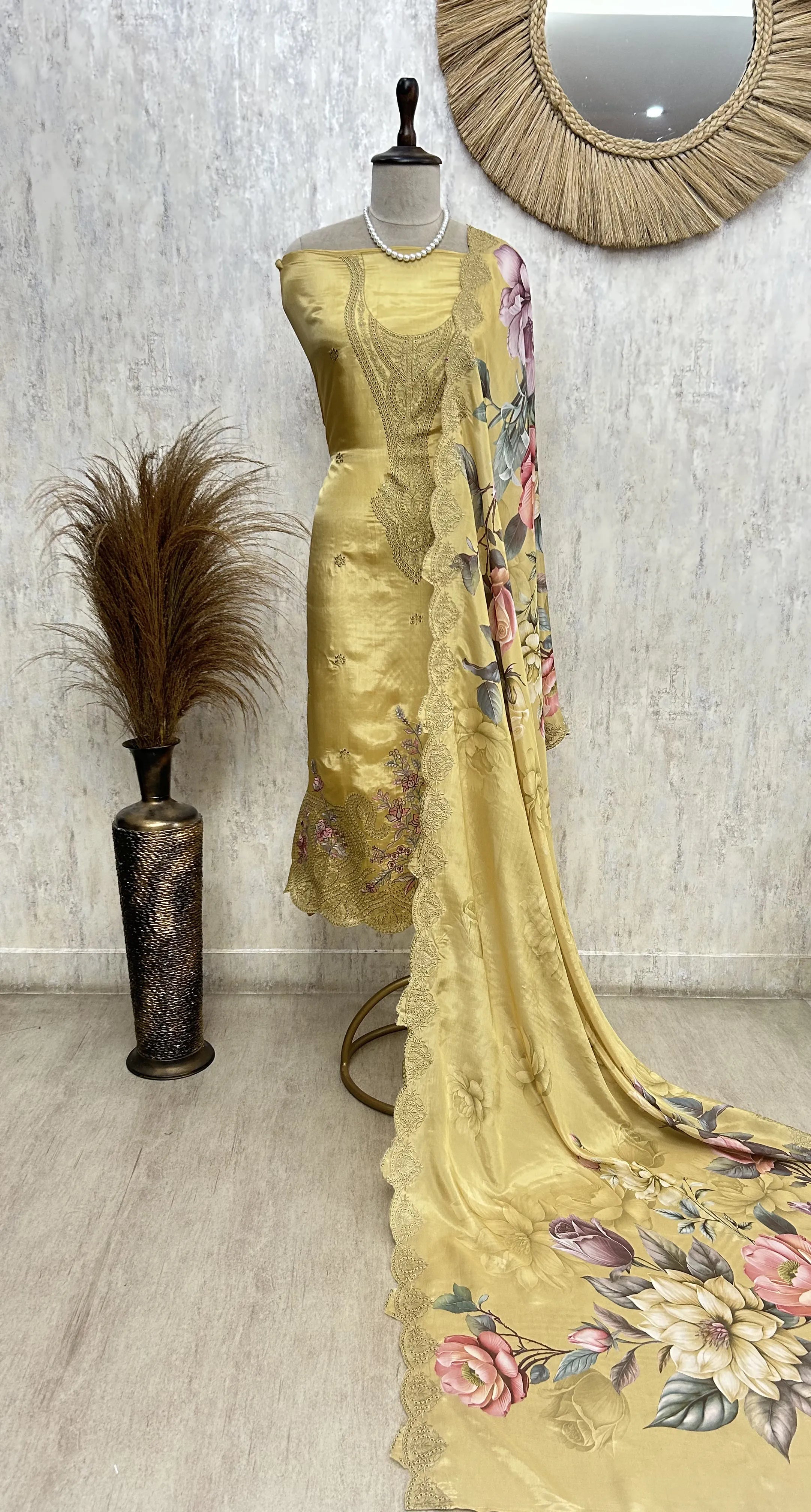 Elevate your wardrobe with this exquisite unstitched silk suit, featuring an intricate floral design that captures timeless elegance. Crafted from premium silk fabric, this ensemble offers a luxurious drape and natural sheen that enhances any complexion. The unstitched format provides complete customization freedom—tailor it to your exact measurements and personal style preferences. Perfect for festive occasions, weddings, or sophisticated everyday wear, this piece combines traditional craftsmanship with contemporary aesthetics. The floral motifs showcase meticulous detailing that reflects superior quality and refined taste.