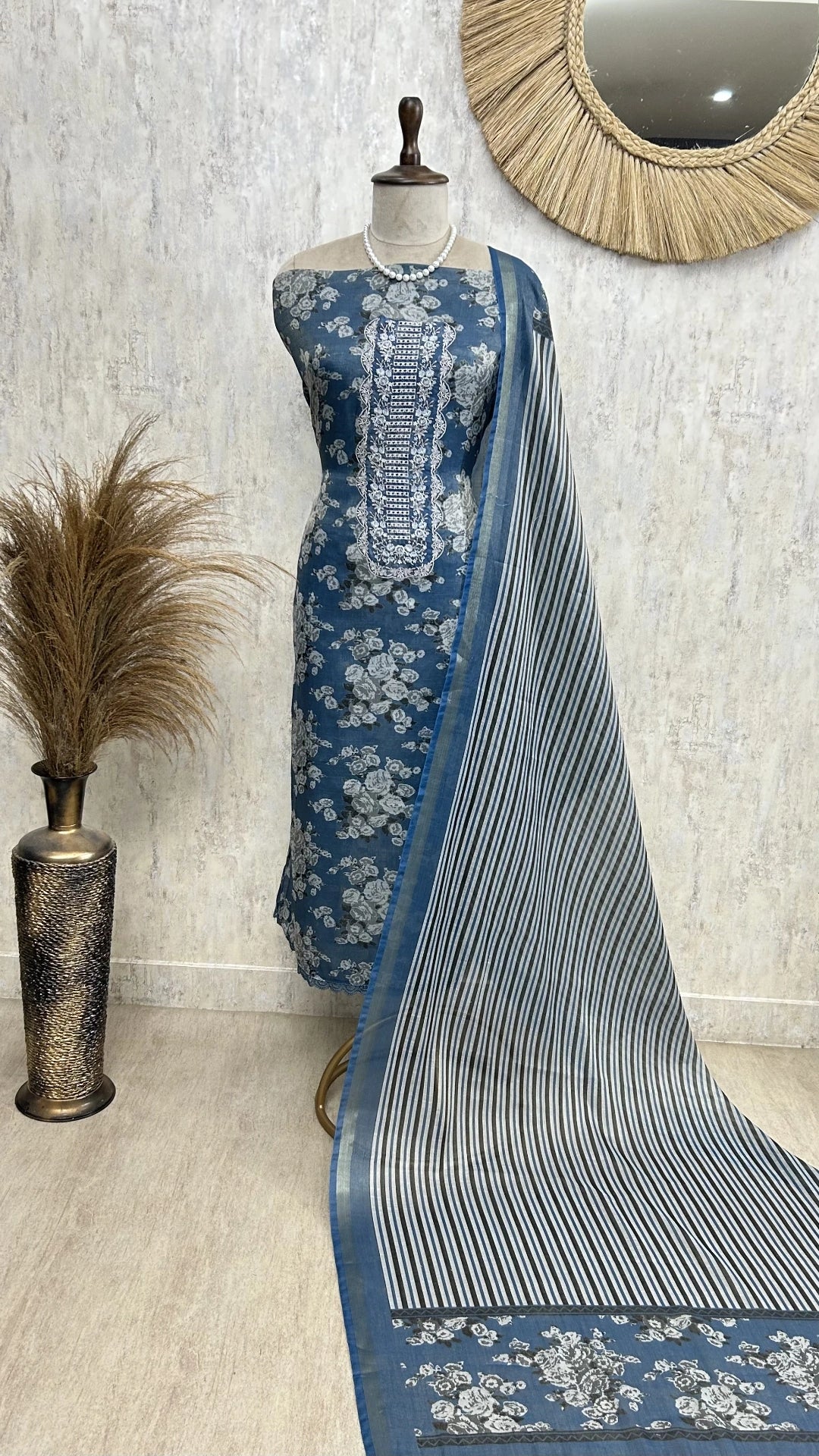 Add a touch of graceful charm to your wardrobe with our Floral Print Jamdani Linen Unstitched Suit Set. Crafted from lightweight, breathable linen, this elegant set features delicate floral prints. Perfect for festive occasions, brunches, or day-to-day elegance, it offers both comfort and sophistication. The set includes a beautifully printed linen kurta fabric, a soft Cotton bottom, and a matching printed linen dupatta.