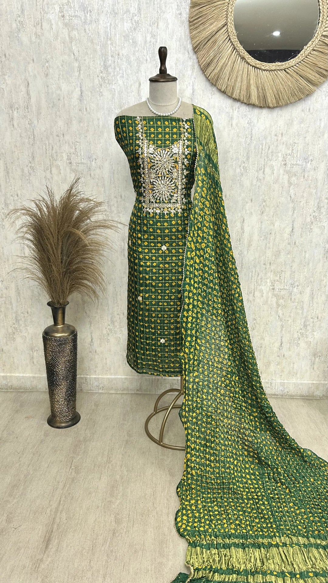 Elevate your traditional wardrobe with the Ghadchola Chanderi Unstitched Suit Set. Crafted from premium Chanderi fabric, this set showcases the intricate Ghadchola weave, known for its timeless elegance and delicate zari work. Perfect for customization, it allows you to tailor your outfit to precise measurements while ensuring luxurious comfort and a graceful drape. Ideal for festive occasions and formal gatherings, this suit set combines cultural heritage with versatile style.