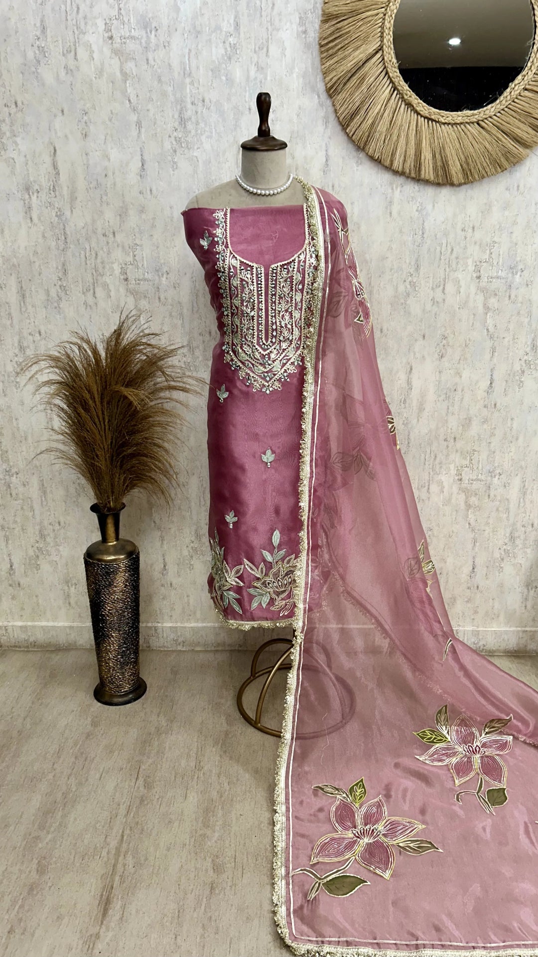 This Glass Organza Unstitched Suit Set includes a finely crafted glass organza dupatta, offering a delicate and elegant look. The unstitched fabric provides the flexibility to customize your fit, while the lightweight glass organza material ensures comfort and graceful drape. Ideal for creating sophisticated traditional wear, this set is perfect for tailoring timeless outfits that balance style and refinement.