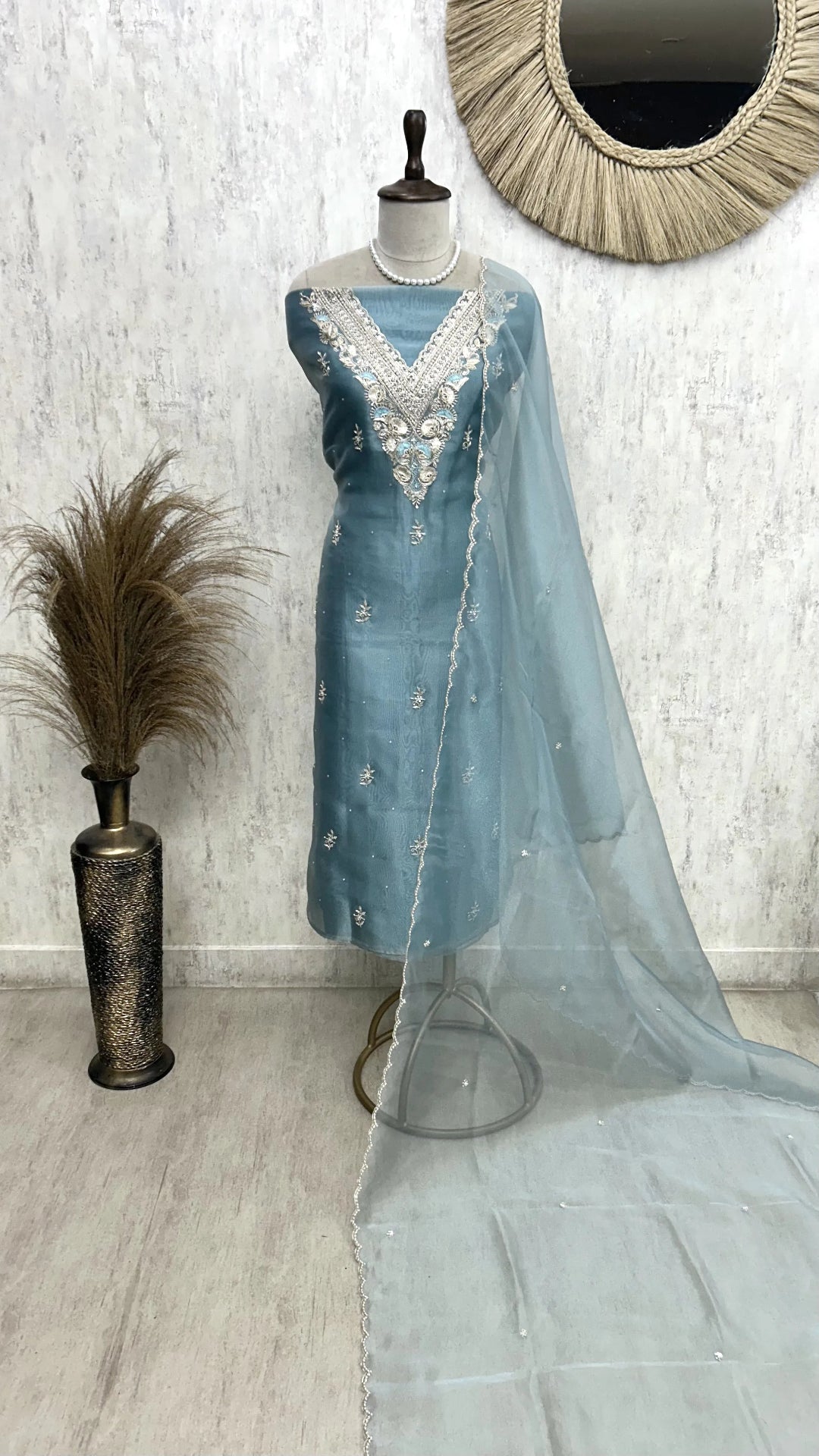 Elevate your wardrobe with this Glass Organza Unstitched Suit Set, paired with a matching Glass Organza Dupatta. The sheer, lightweight fabric offers a delicate texture perfect for customization according to your style. Its breathable quality ensures comfort during warmer days, while the elegant transparency adds a subtle sophistication, making it ideal for formal occasions or festive wear. This unstitched set provides the flexibility to tailor a garment that fits you perfectly, blending traditional charm with contemporary elegance.