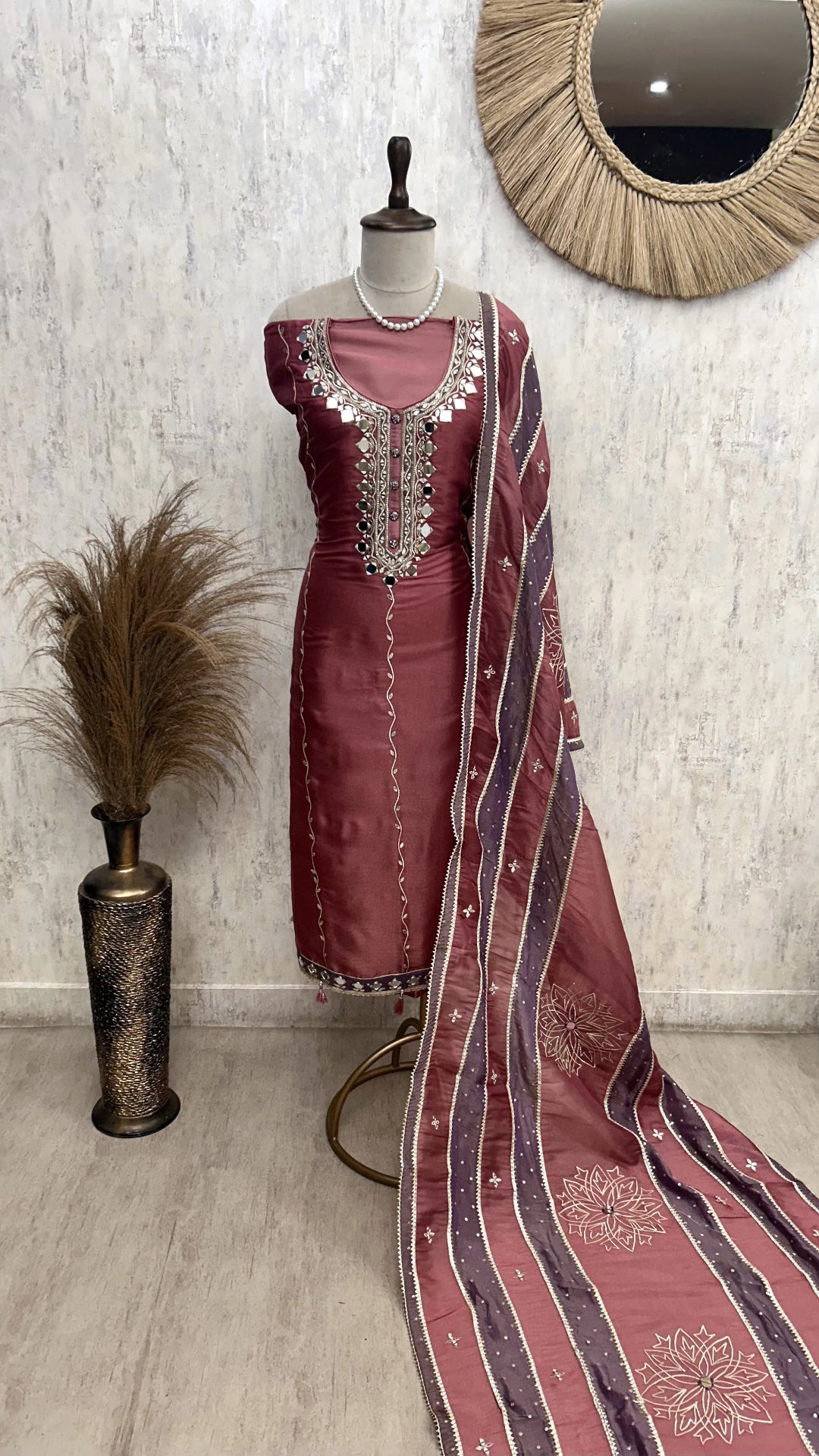 Elevate your wardrobe with this Glass Organza unstitched suit set, paired with a delicate organza dupatta. Crafted from lightweight, translucent fabric, this set offers a refined texture and subtle sheen, ideal for tailoring a customized outfit. The breathable material ensures comfort in warmer climates, while the organza dupatta adds an elegant, airy finish. Perfect for creating sophisticated ethnic ensembles with a modern touch.