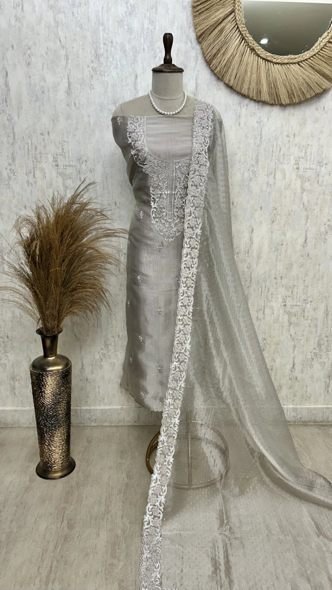 Add a touch of shimmer to your ethnic style with this exquisite Glass Organza unstitched suit set, adorned with delicate rhinestone work. The sheer, lightweight fabric gives a graceful drape, while the glossy rhinestones catch the light beautifully, creating a subtle yet striking sparkle. Perfect for festive evenings, celebrations, or special occasions, this ensemble blends elegance with effortless charm.