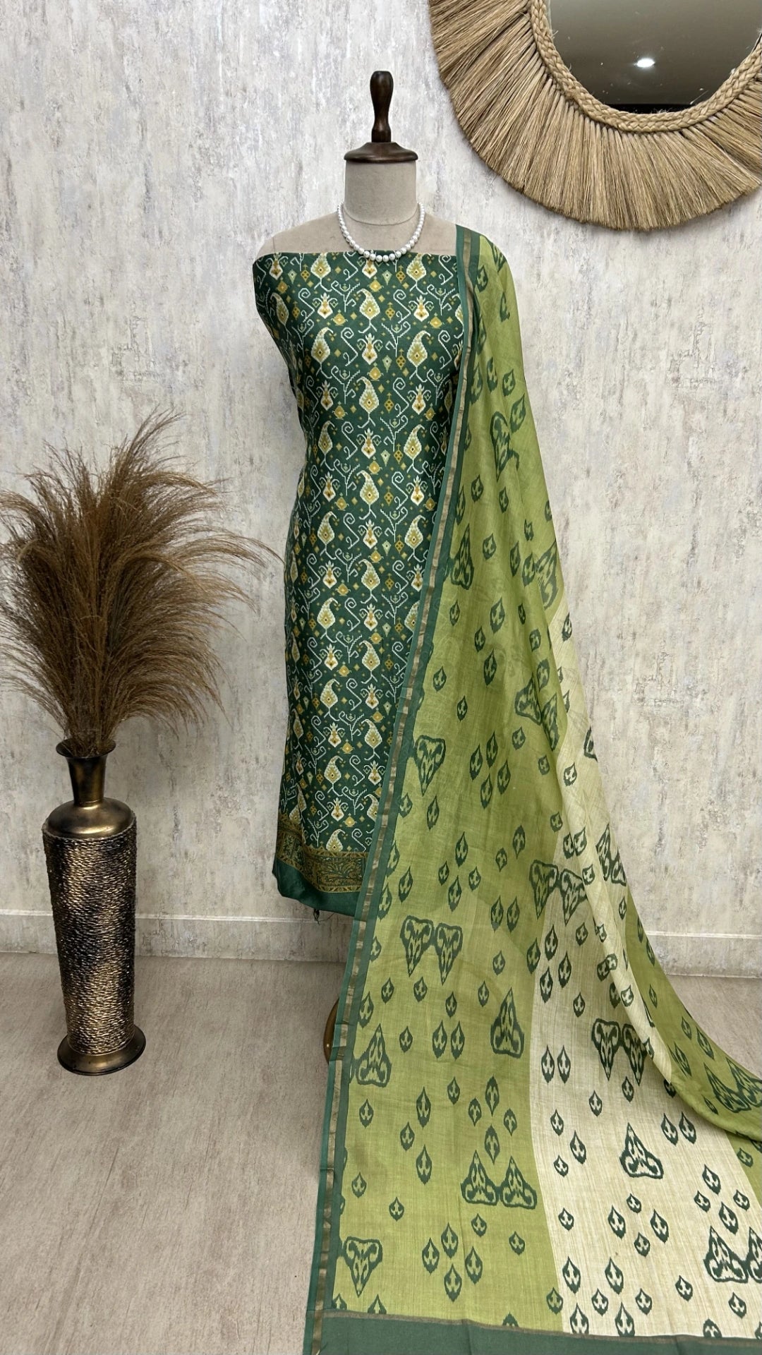Embrace timeless charm with this elegant Maheshwari unstitched suit set, adorned with intricate Ikat prints. Crafted from a luxurious Maheshwari silk-cotton blend, this ensemble combines the softness of cotton with the sheen of silk, offering both comfort and grace. The striking Ikat patterns lend it a rich, ethnic appeal—perfect for festive gatherings, intimate celebrations, or graceful everyday wear.