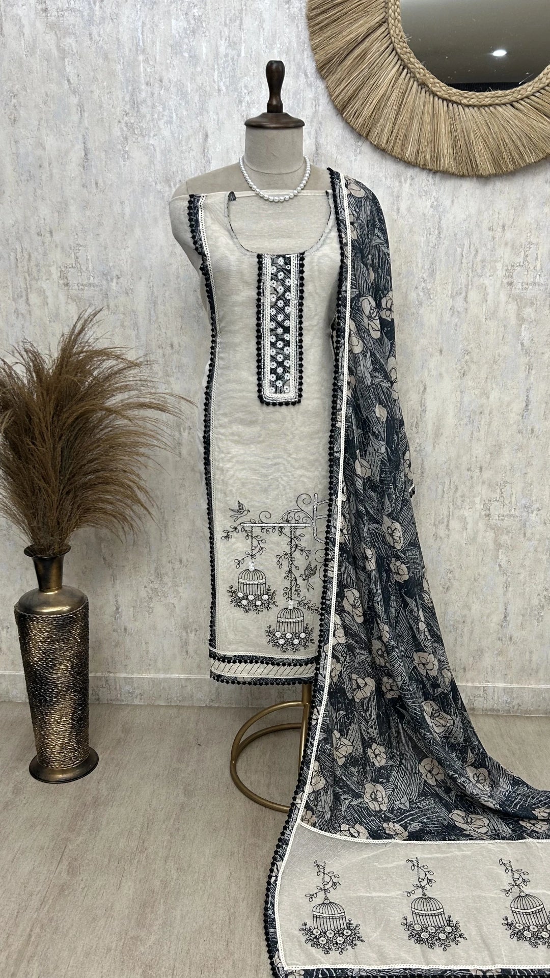 Elevate your ethnic wardrobe with our Kota Unstitched Suit Set, crafted from airy, semi-sheer Kota Doria fabric and adorned with elegant thread work on the hemline. Known for its lightweight texture and graceful drape, this suit set is the perfect blend of comfort and refined charm.