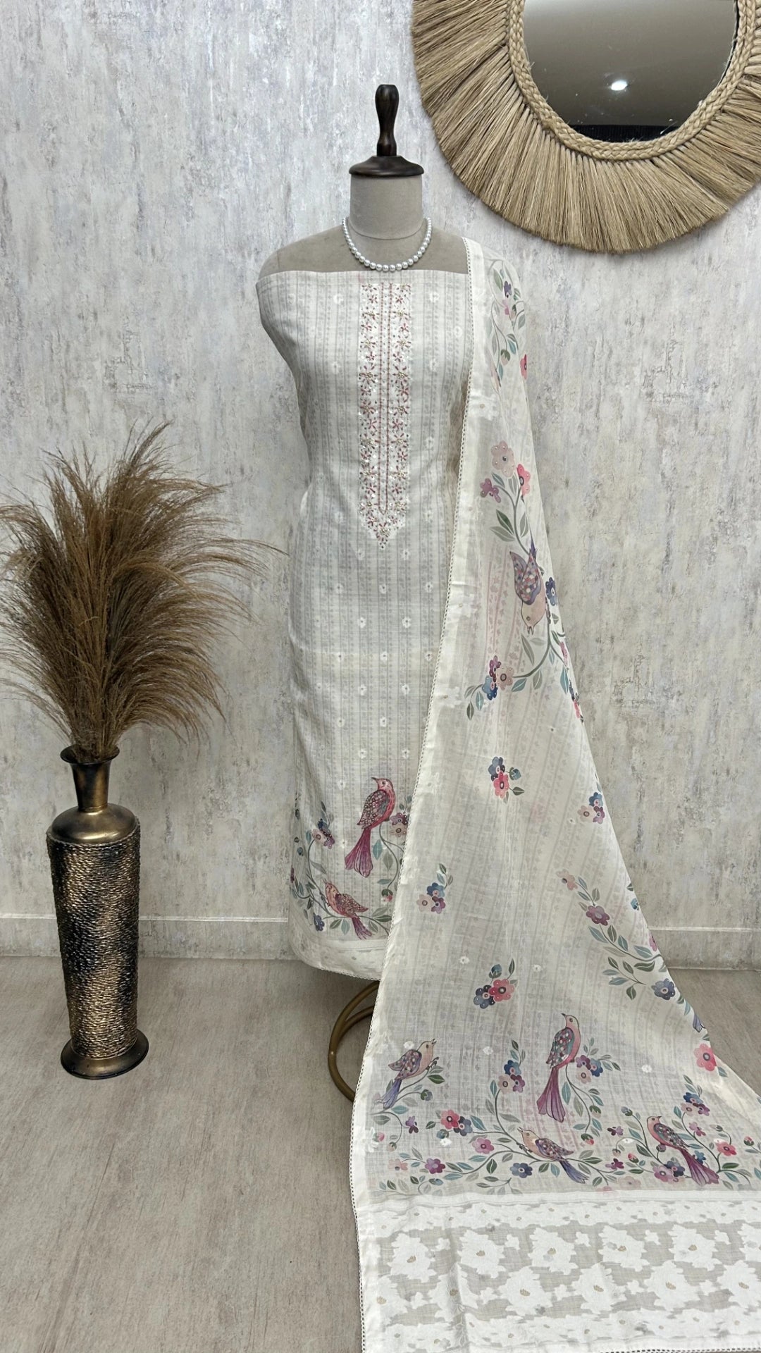 This unstitched linen suit set features elegant bird motifs paired with intricate kantha embroidery, blending traditional craftsmanship with breathable fabric. Ideal for those seeking a sophisticated yet comfortable outfit, it offers versatility for custom tailoring to your preferred fit and style. The natural texture of linen ensures durability and a refined look, making it perfect for both casual and formal occasions.