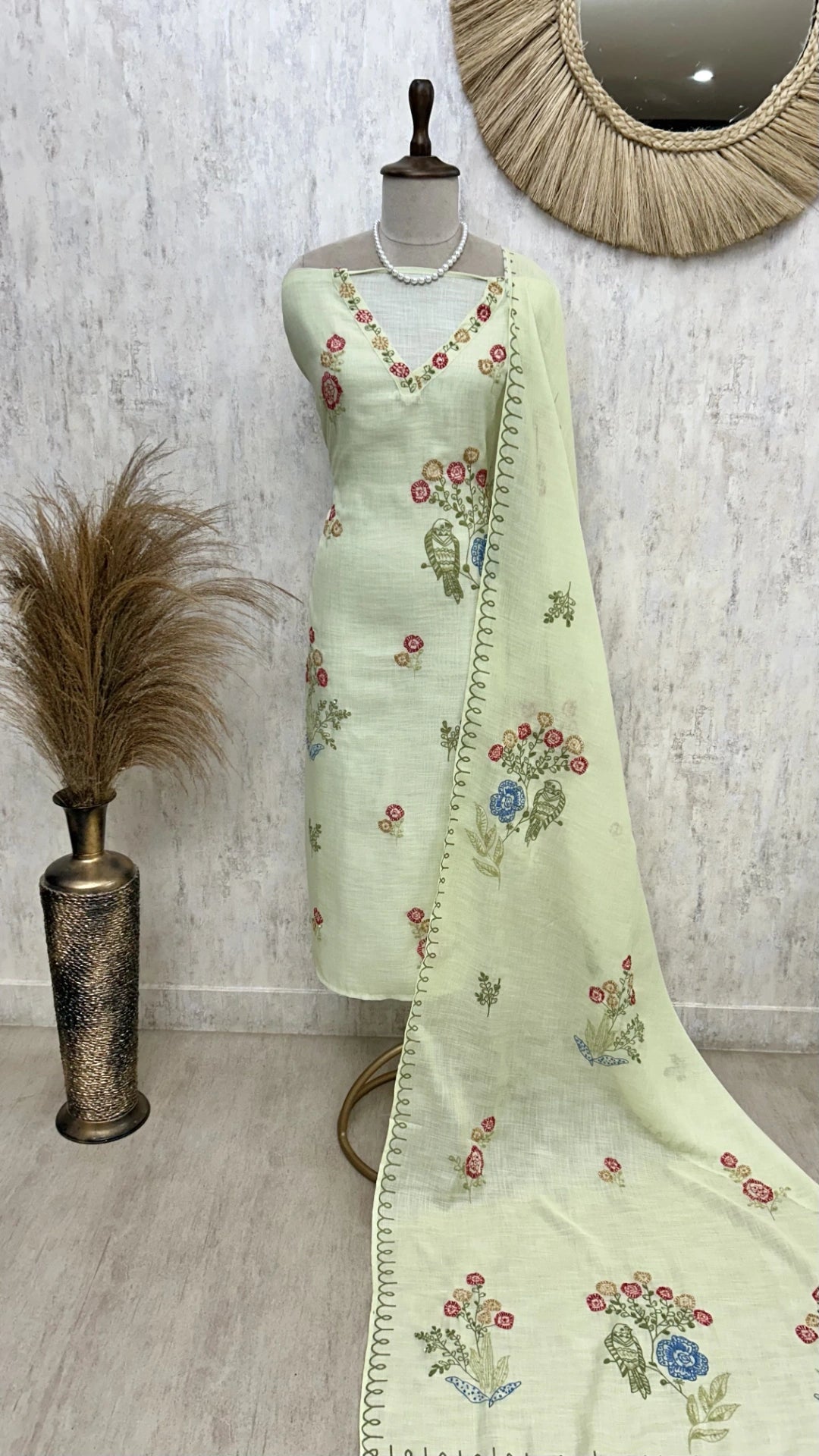 Grace meets craftsmanship in this Linen Unstitched Suit Set, adorned with delicate Kantha work and charming bird motifs. The natural texture of linen offers breathability and structure, perfect for all-day wear in any season. Intricately hand-done Kantha stitches highlight the neckline and motifs, adding an artisanal touch that stands out with subtle elegance.
