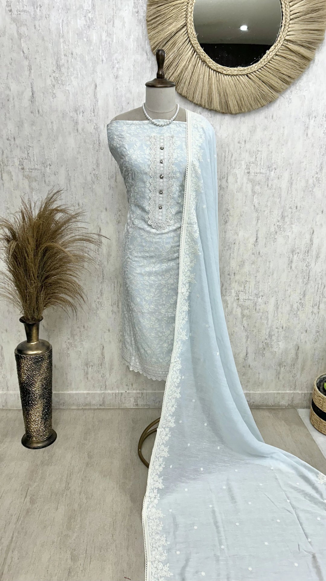 Elevate your wardrobe with this Linen Unstitched Suit Set featuring delicate thread embroidery. Crafted from breathable linen fabric, it ensures comfort and durability, ideal for warm climates. The intricate embroidery adds a refined, elegant touch, allowing you to personalize the suit while maintaining a sophisticated appearance. This unstitched set gives you the flexibility to tailor it according to your style and fit preferences, blending traditional craftsmanship with practical versatility. Perfect for those seeking quality and elegance in their custom attire.