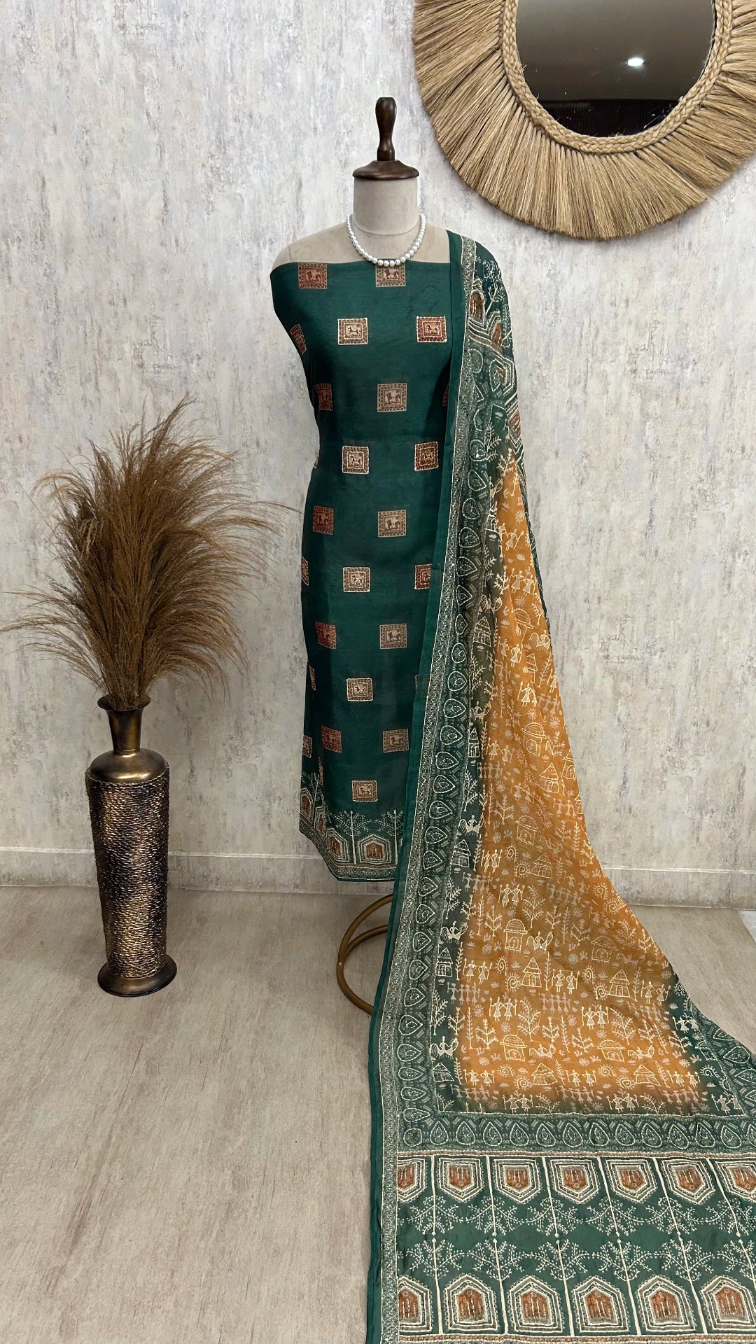 The Maheshwari Unstitched Suit Set with intricate Kantha work showcases traditional craftsmanship blended with versatile design. Crafted from premium fabric, this unstitched set allows for a tailored fit, ensuring comfort and elegance. The detailed Kantha embroidery enhances the suit’s aesthetic, making it suitable for both formal and festive occasions. Perfect for those who appreciate artisanal quality and customizable attire.