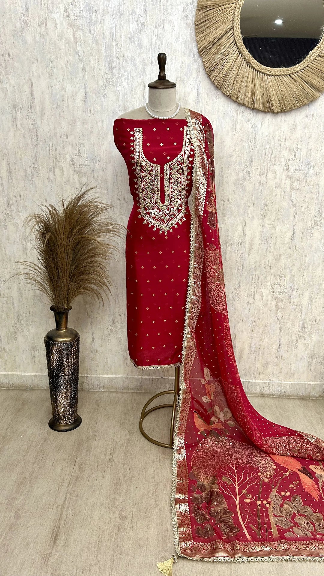 Elevate your wardrobe with this exquisite Organza Unstitched Suit Set featuring intricate Gota work. Crafted from delicate organza fabric, it offers a lightweight and elegant base perfect for custom tailoring. The traditional Gota embellishments add a refined touch of craftsmanship, enhancing the overall aesthetic. Ideal for festive occasions or formal events, this set provides both versatility and sophistication for a standout look.
