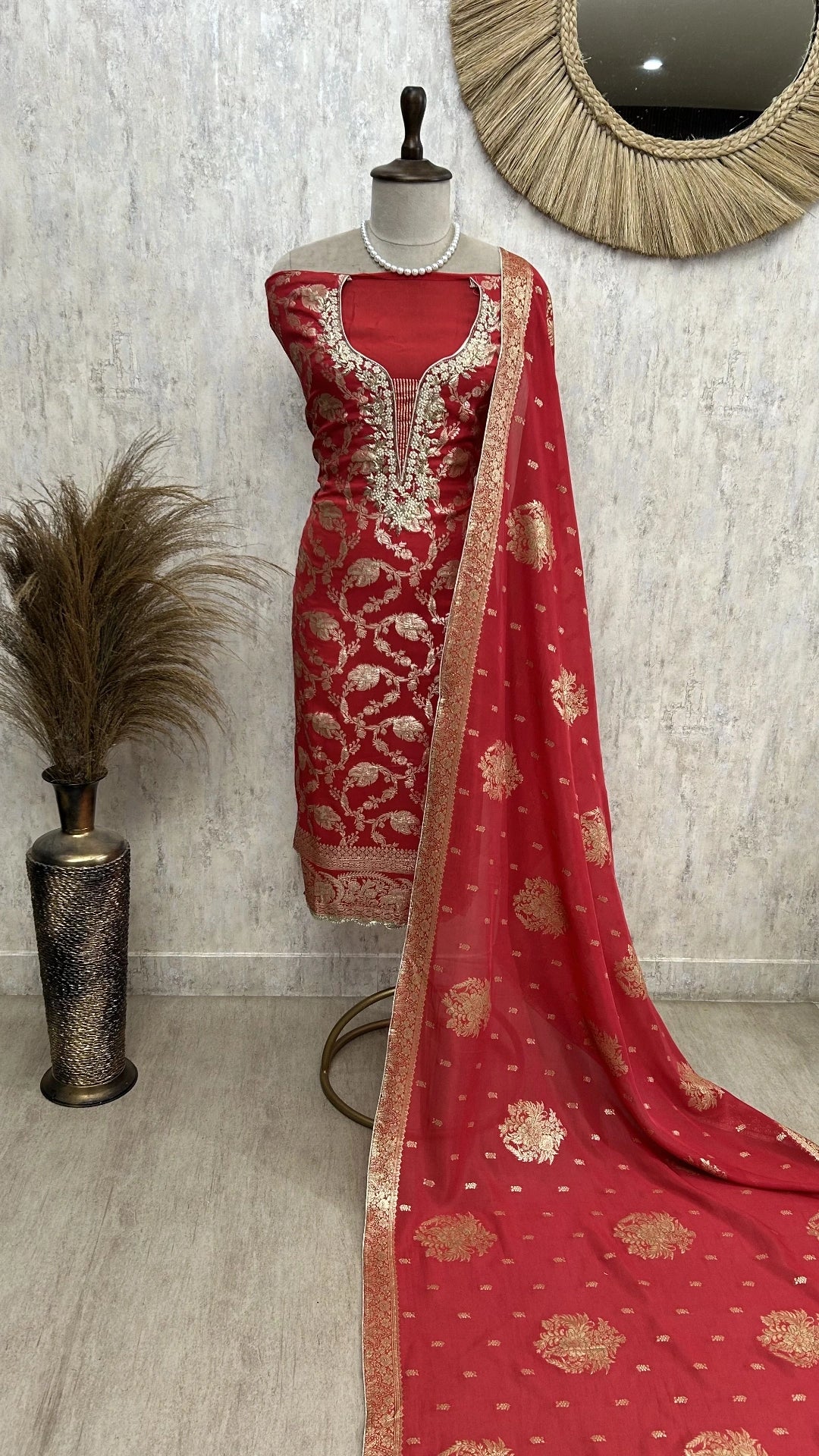 Bring home the elegance of tradition and the grace of fine craftsmanship with our Organza Unstitched Suit Set featuring Banarasi Weave. Designed to reflect the grandeur of Indian heritage, this ensemble is a timeless addition to your ethnic wardrobe—perfect for celebrations, festive gatherings, and special occasions where you want to stand out effortlessly.