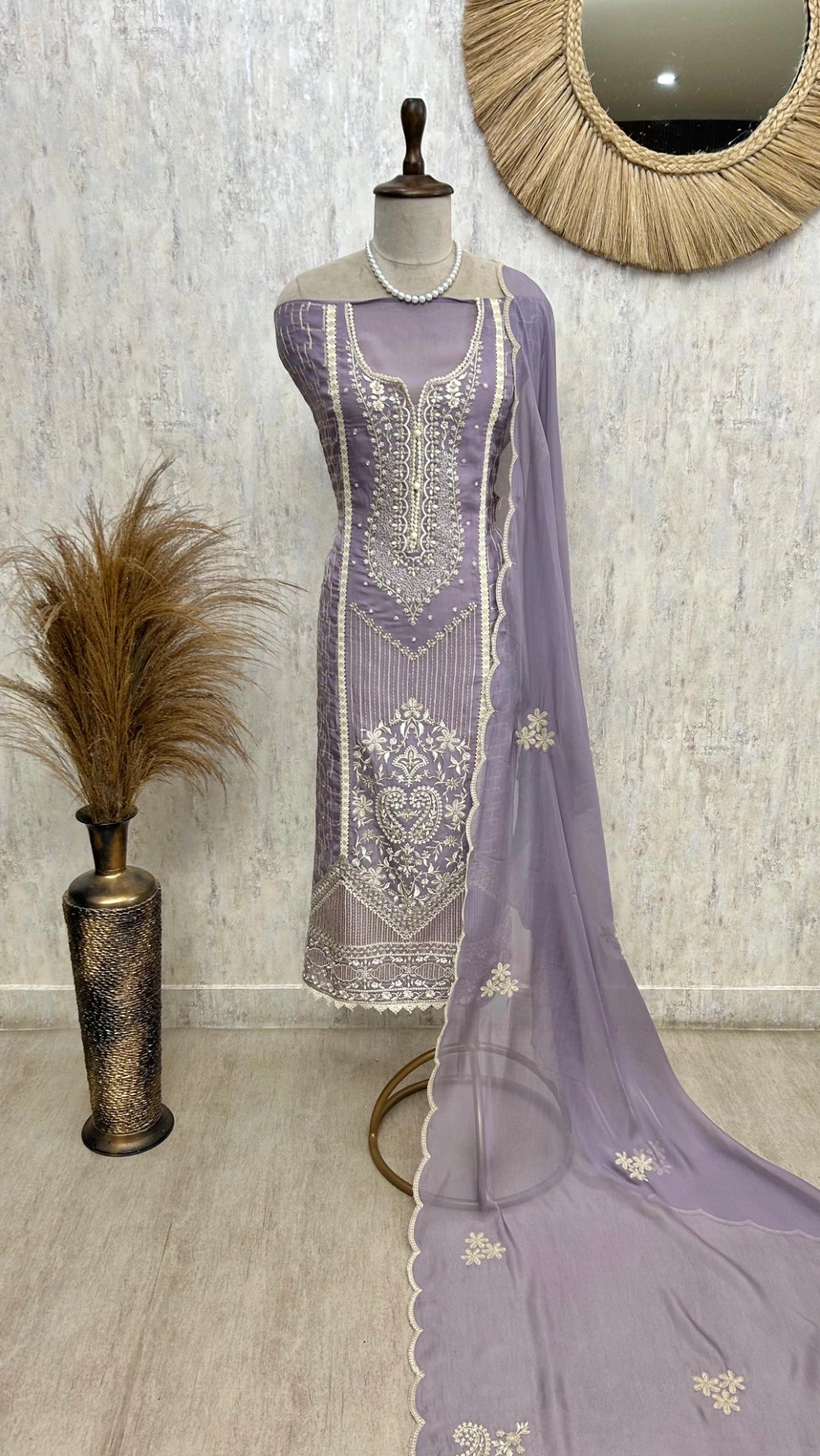 Elevate your wardrobe with this Organza Unstitched Suit Set featuring delicate bead work. Crafted from lightweight, sheer organza fabric, it offers a luxurious base for custom tailoring. The intricate bead embellishments add subtle elegance, making it ideal for formal occasions or festive wear. This unstitched set allows you to personalize the fit and style, ensuring a perfect, expert finish tailored to your preferences.