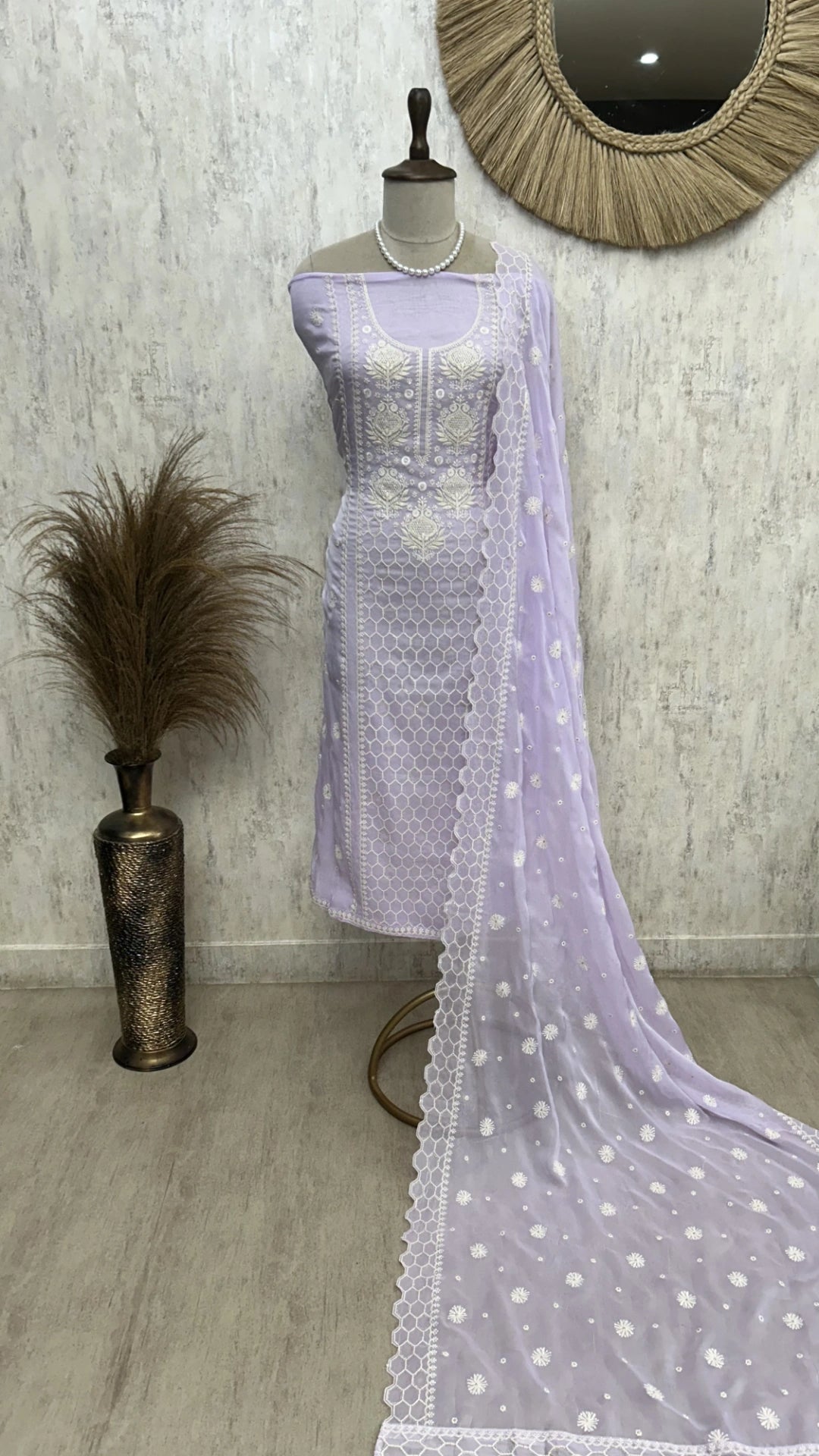 Elevate your wardrobe with this Organza Unstitched Suit Set featuring an intricate honeycomb pattern. Crafted from lightweight, sheer organza fabric, it offers a delicate texture and elegant drape, perfect for custom tailoring. The honeycomb design adds a sophisticated geometric appeal, making it ideal for formal occasions or festive wear. This unstitched set allows you to personalize the fit and style, ensuring a refined and comfortable ensemble tailored to your taste.