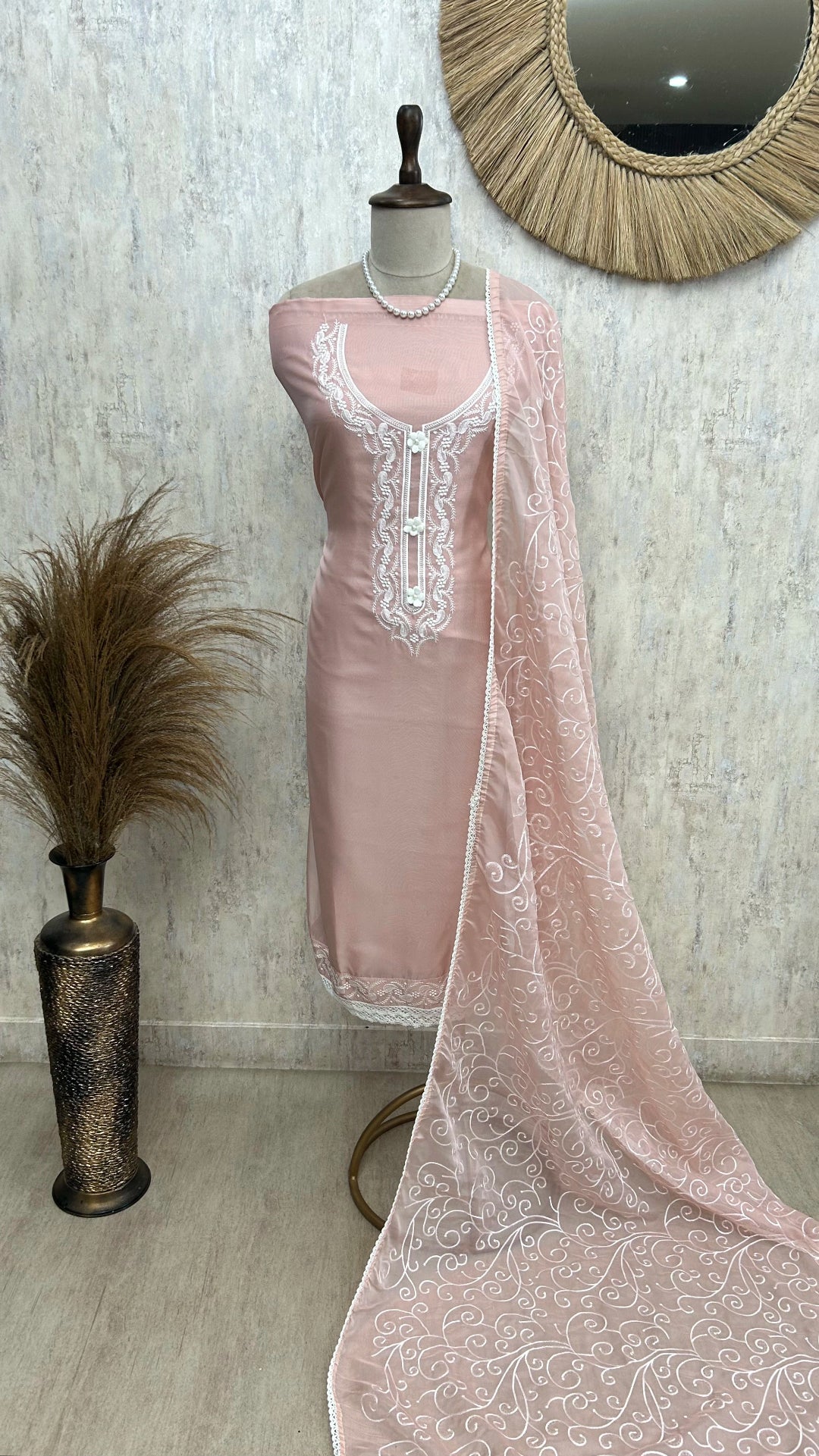 Crafted from delicate organza fabric, this unstitched suit set offers a versatile canvas for custom tailoring. The included organza dupatta complements the ensemble with a sheer, lightweight elegance. Perfect for creating sophisticated traditional attire, this set ensures a refined look with breathable comfort and graceful drape. Ideal for formal occasions, it allows you to personalize the fit and style to your preferences.