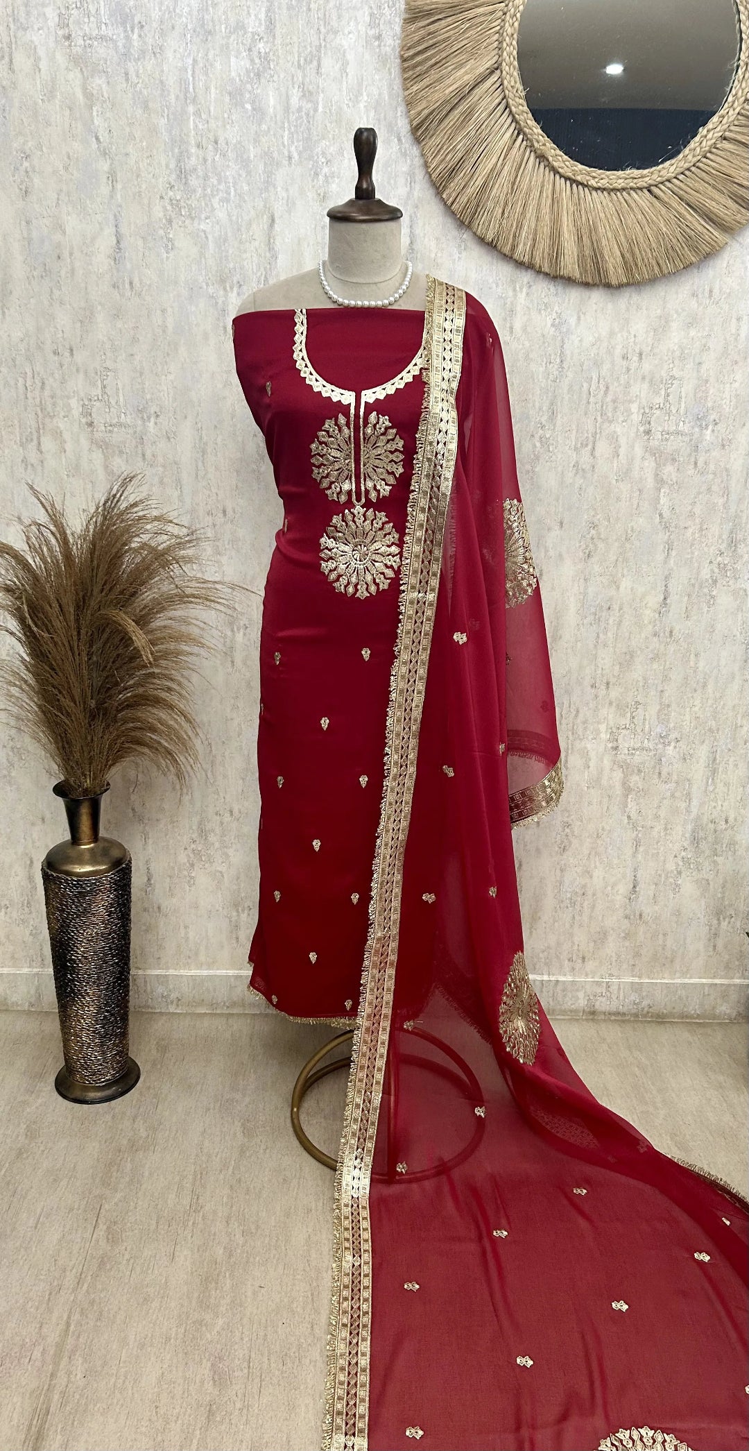 Embrace elegance with this Organza Unstitched Suit Set featuring a delicate Organza dupatta. Crafted from lightweight, breathable fabric, it offers a luxurious base perfect for customized tailoring. The sheer texture of the dupatta enhances the ensemble with a soft, graceful finish. Ideal for creating sophisticated ethnic wear, this set combines comfort with refined style, allowing you to design an outfit tailored precisely to your taste and fit requirements.