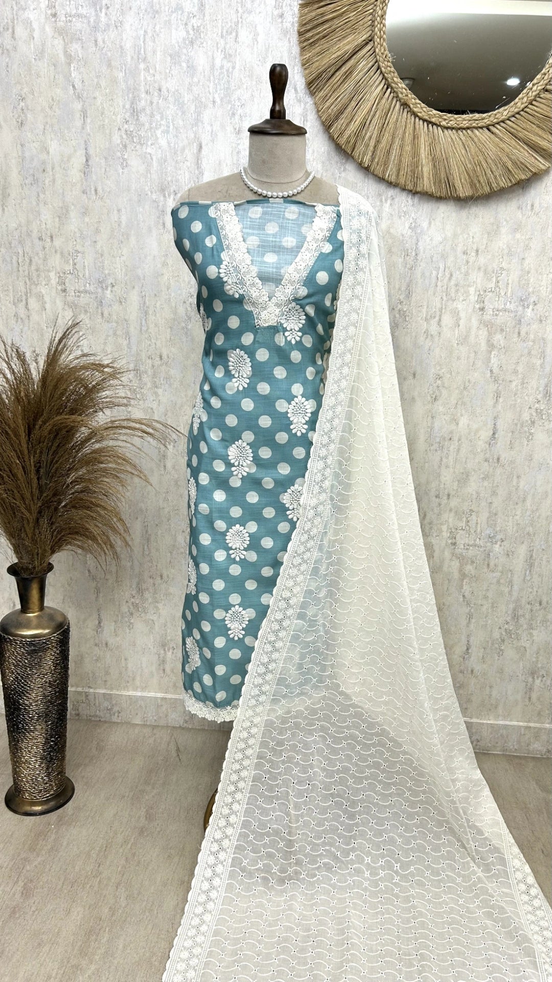 The kurta fabric features classic polka dot prints, giving it a youthful and lively appeal. Paired with a solid cotton bottom and a coordinated dupatta, this set is easy to style for casual outings, brunches, or everyday wear.