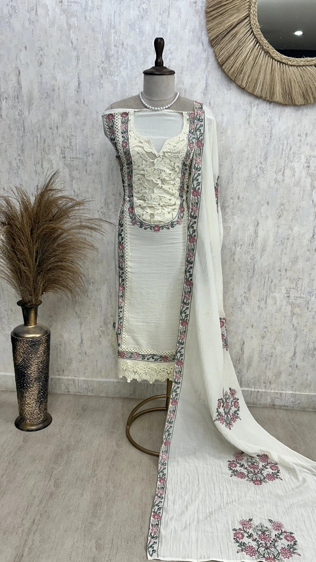 Step into subtle elegance with this Schiffli Embroidery Mul Unstitched Suit Set, designed to bring grace and lightness to your everyday ethnic wear. Made from ultra-soft mul cotton, this set ensures breathable comfort while exuding effortless charm.