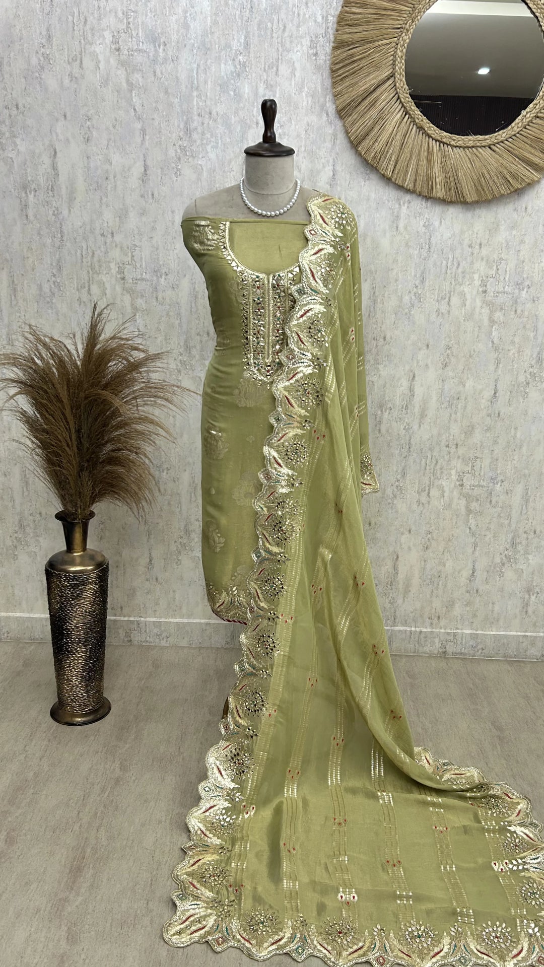 Indulge in elegance with our Gota/Leather Work Tissue Unstitched Suit Set, a perfect blend of tradition and modern craftsmanship. Made from luxurious tissue fabric, this suit set features exquisite gota and leather work, adding a regal charm to your ethnic ensemble. The lightweight and shimmering texture makes it ideal for festive occasions, weddings, and celebrations.