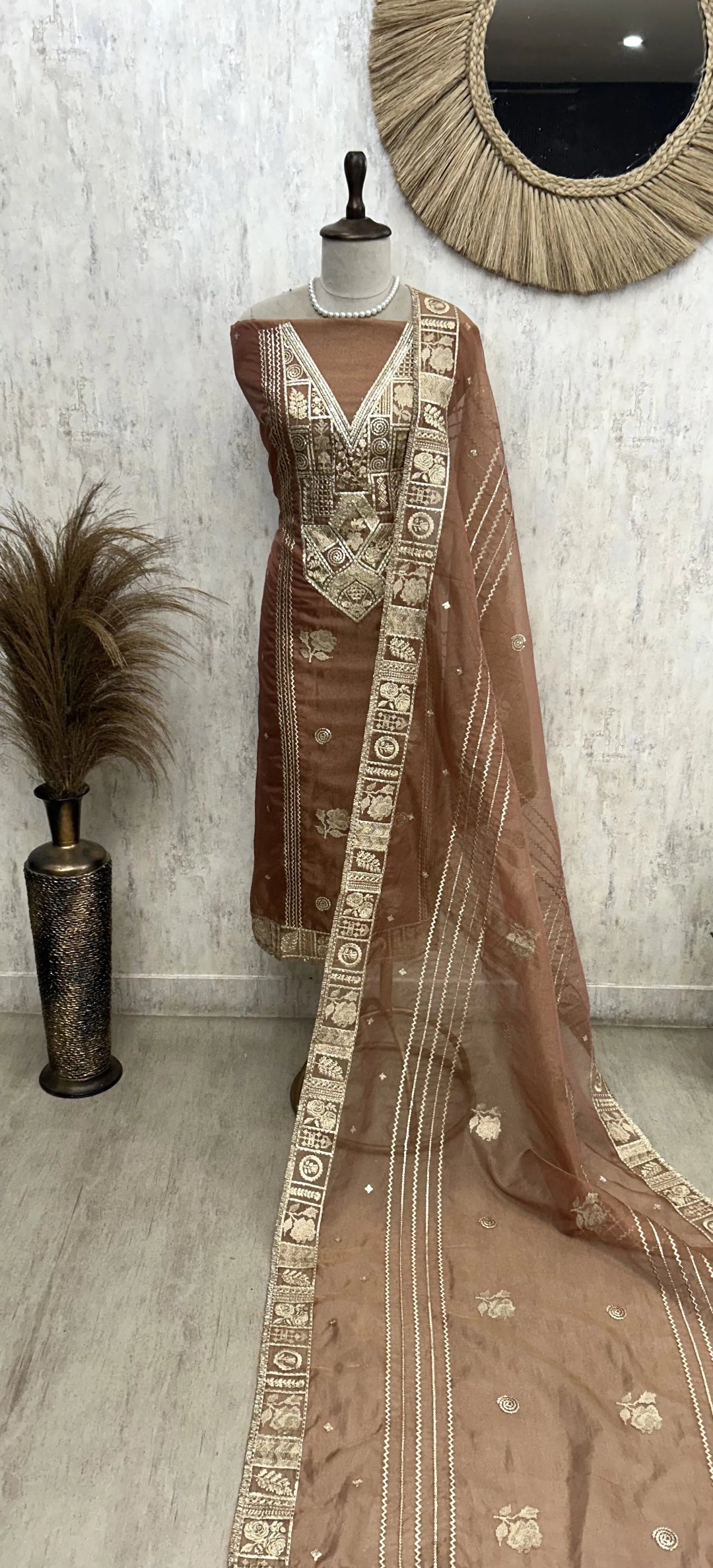This Tissue Organza Unstitched Suit Set features finely woven fabric that offers a lightweight and elegant feel, perfect for custom tailoring to your preferred style. The matching Tissue Organza dupatta complements the suit, enhancing its graceful appearance. Ideal for formal occasions, this set allows expert craftsmen to create a sophisticated ensemble with delicate texture and subtle sheen.