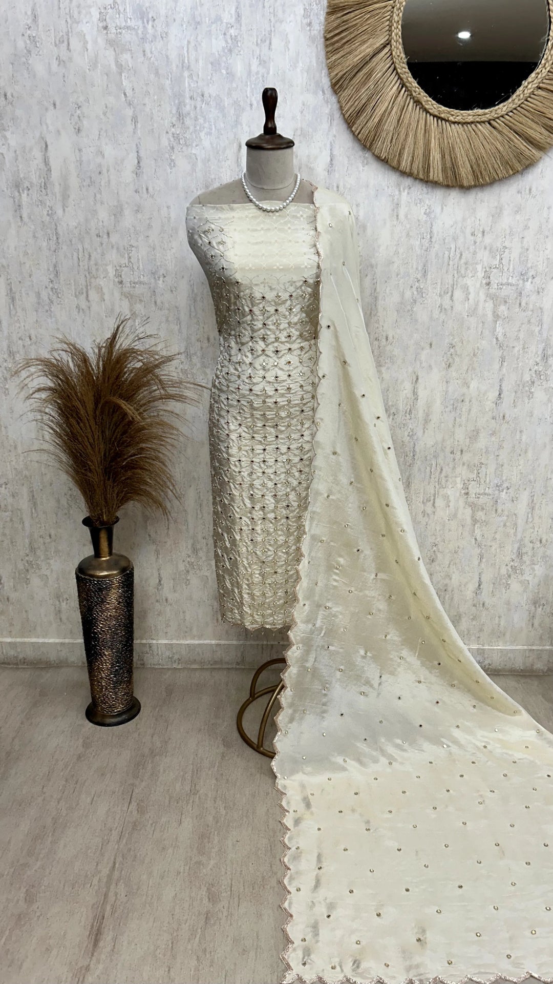 Experience refined elegance with this Tissue Unstitched Suit Set, paired with a delicate tissue dupatta. Crafted from lightweight, breathable fabric, it ensures comfort while providing a graceful drape. Its unstitched design offers versatility, allowing you to customize the fit to your preference. The accompanying tissue dupatta adds a subtle sheen, completing a sophisticated ensemble ideal for both casual and festive occasions.