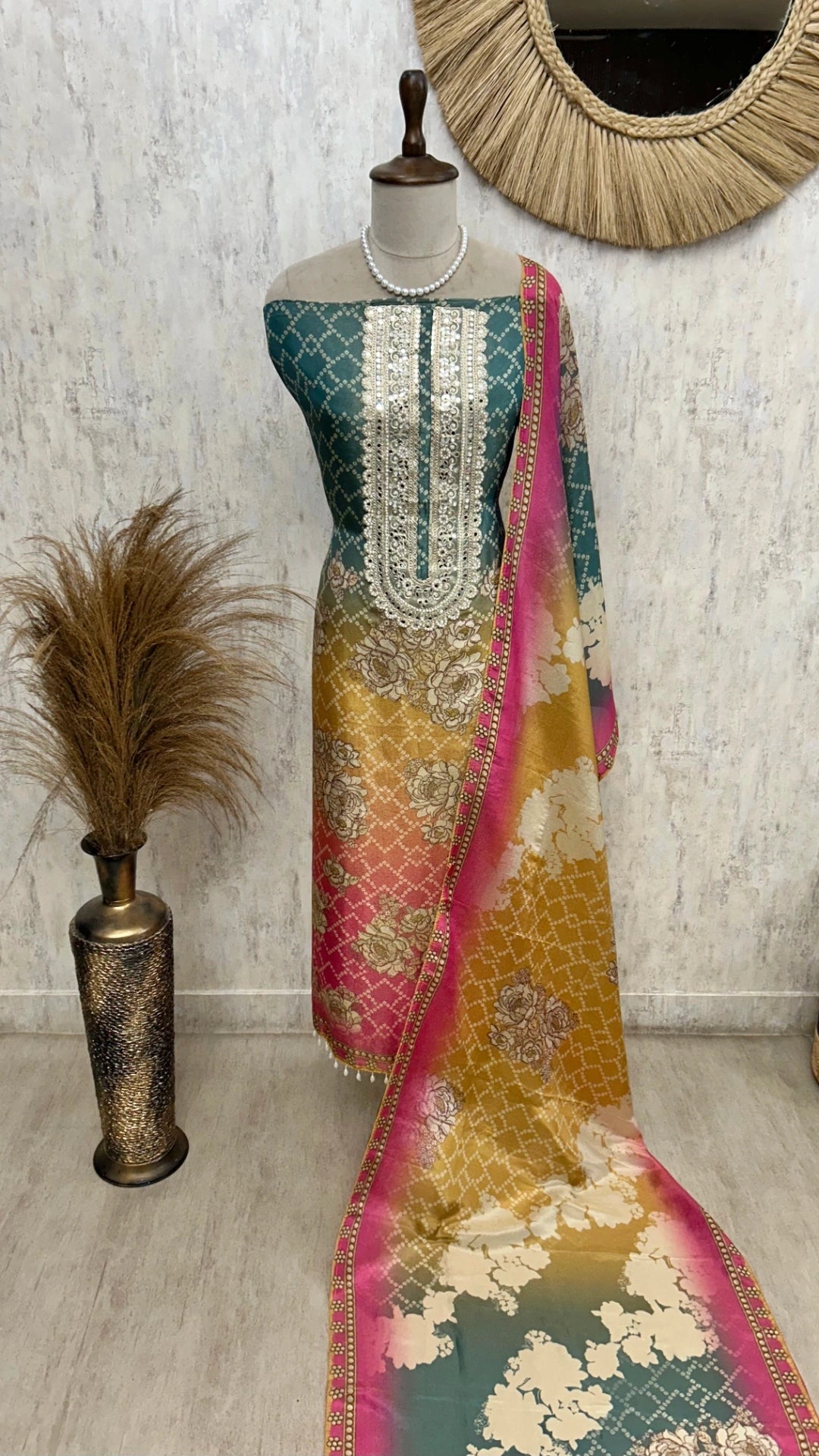 Elevate your wardrobe with this Tissue Unstitched Suit Set featuring a sophisticated ombre effect. Crafted from lightweight tissue fabric, it offers a delicate texture and graceful drape, ideal for custom tailoring. The gradual color transition adds a modern, elegant touch, making it perfect for both casual and formal occasions. This unstitched set allows you to personalize the fit and style to your preference, ensuring a unique and refined look.