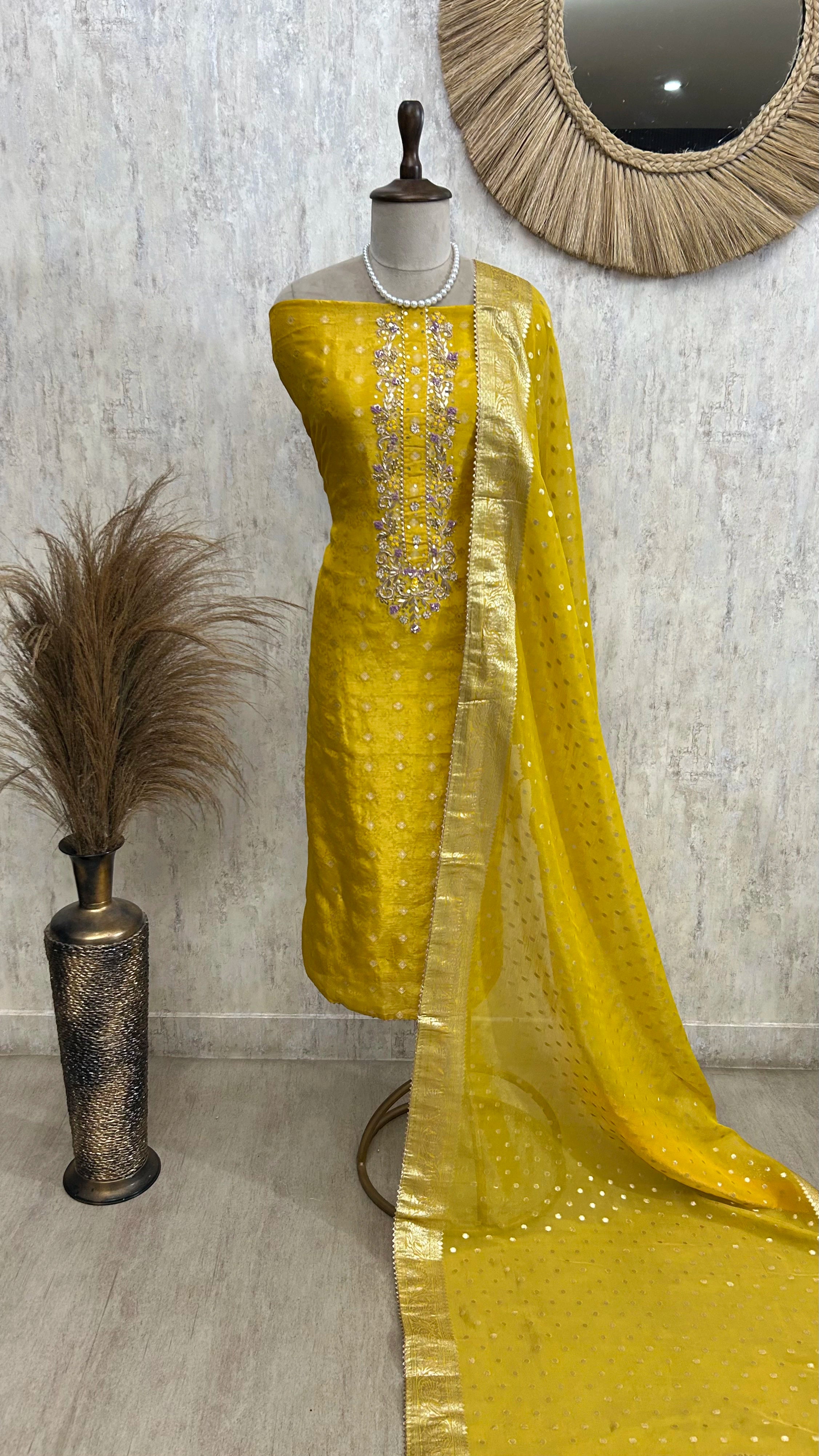 Elevate your wardrobe with this unstitched tissue suit set, crafted from lightweight and breathable fabric for lasting comfort. The set includes a delicate organza dupatta, adding a touch of elegance and translucence to your ensemble. Perfect for customizing your fit, this fabric combination offers both sophistication and versatility for various occasions.