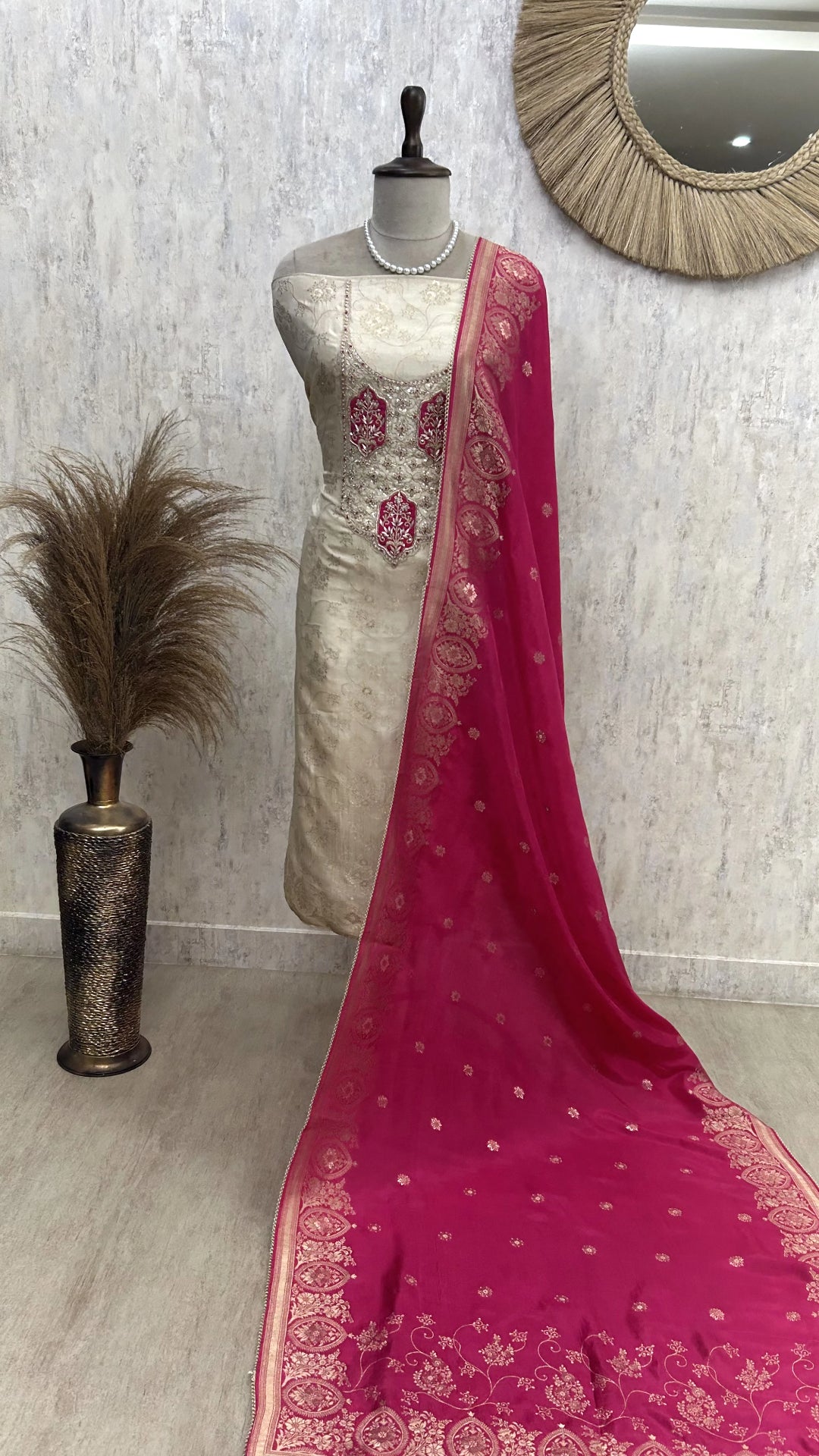 Indulge in timeless elegance with our Zardosi & Pearl Work Dola Silk Unstitched Suit Set. Crafted from premium Dola silk, this luxurious ensemble features intricate Zardosi embroidery and delicate pearl embellishments, adding a regal charm to your ethnic wardrobe. The unstitched suit set allows for personalized tailoring, ensuring a perfect fit for any occasion.