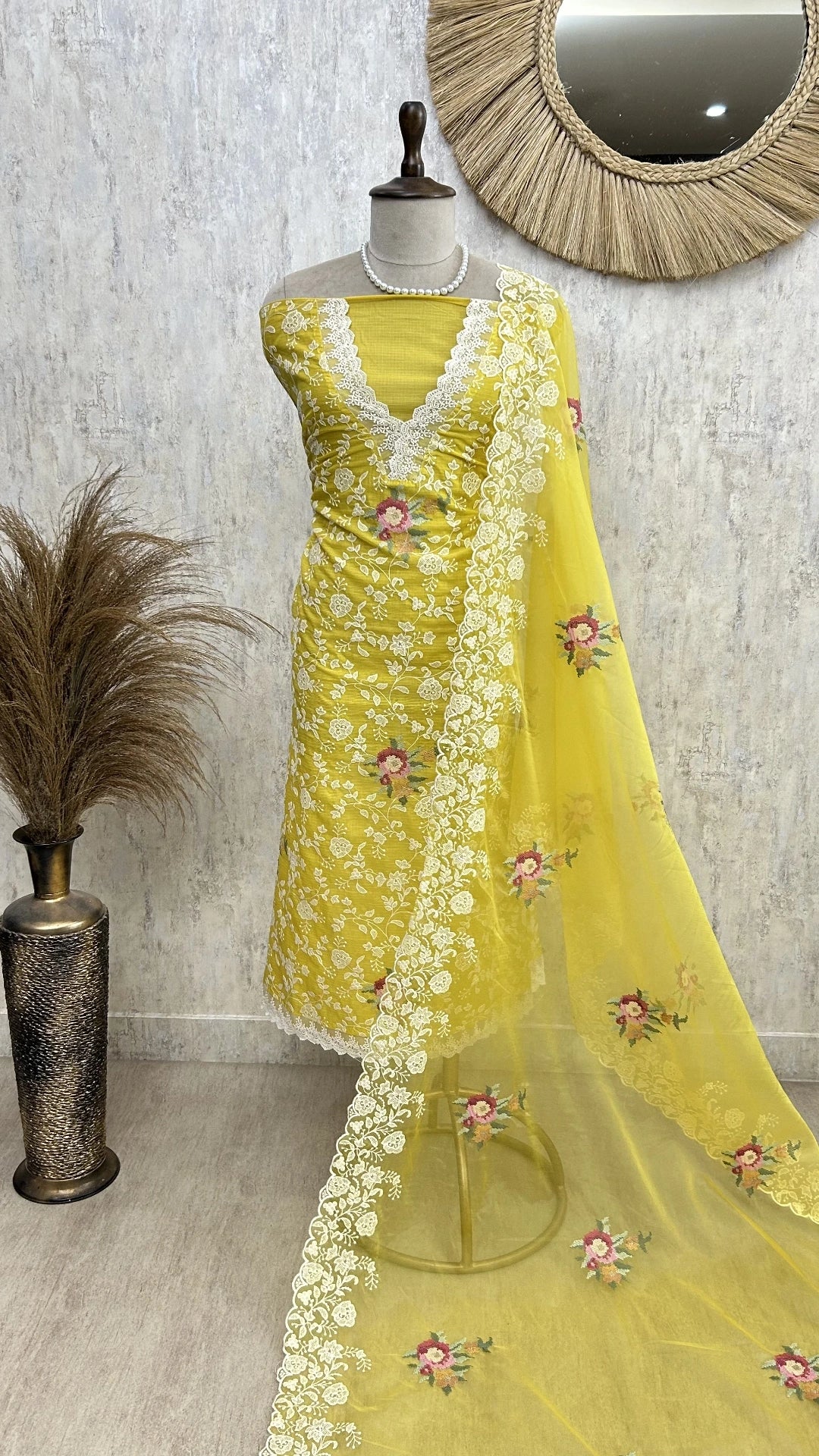 The kurta fabric features traditional cross-stitch motifs that add a splash of color and texture, while the soft Kota weave ensures breathability—ideal for warm weather and casual daywear. The matching bottom fabric and coordinated embroidered dupatta complete the look, offering a graceful and cohesive ensemble.