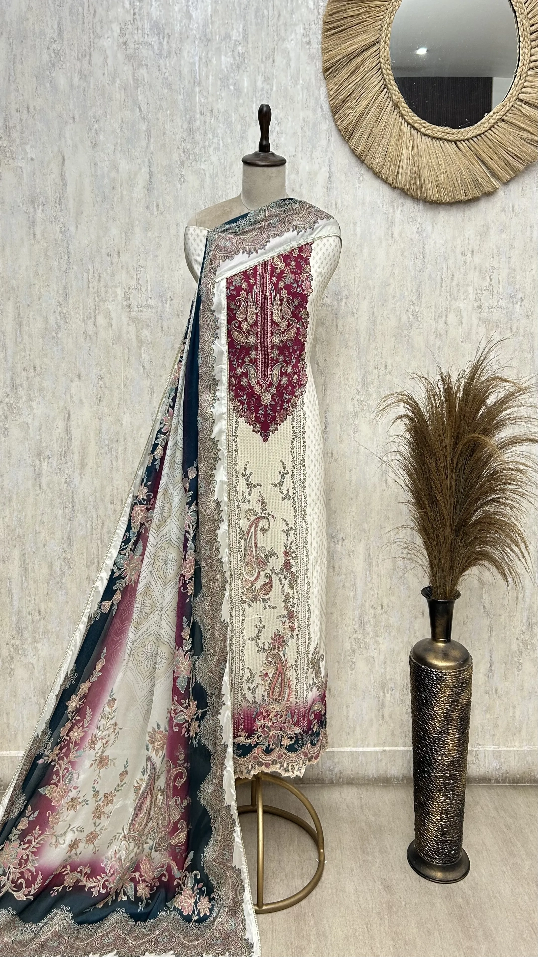 Elevate your ethnic wardrobe with this stunning Zari Work Crepe Unstitched Suit Set. Crafted from premium crepe fabric, this three-piece ensemble features intricate zari embroidery that adds a touch of traditional elegance to your collection. The unstitched format gives you complete creative freedom—customize the fit, neckline, and silhouette to match your personal style. Perfect for festive occasions, weddings, and celebrations, this suit set combines timeless craftsmanship with versatile design. The rich zari detailing catches light beautifully, making it an ideal choice for those who appreciate fine embroidery work. Whether you prefer a classic straight cut or a contemporary style, this fabric and design work seamlessly with any tailoring vision. Ideal for special events and traditional gatherings, this suit set is a wardrobe essential for anyone who values quality and artistry.